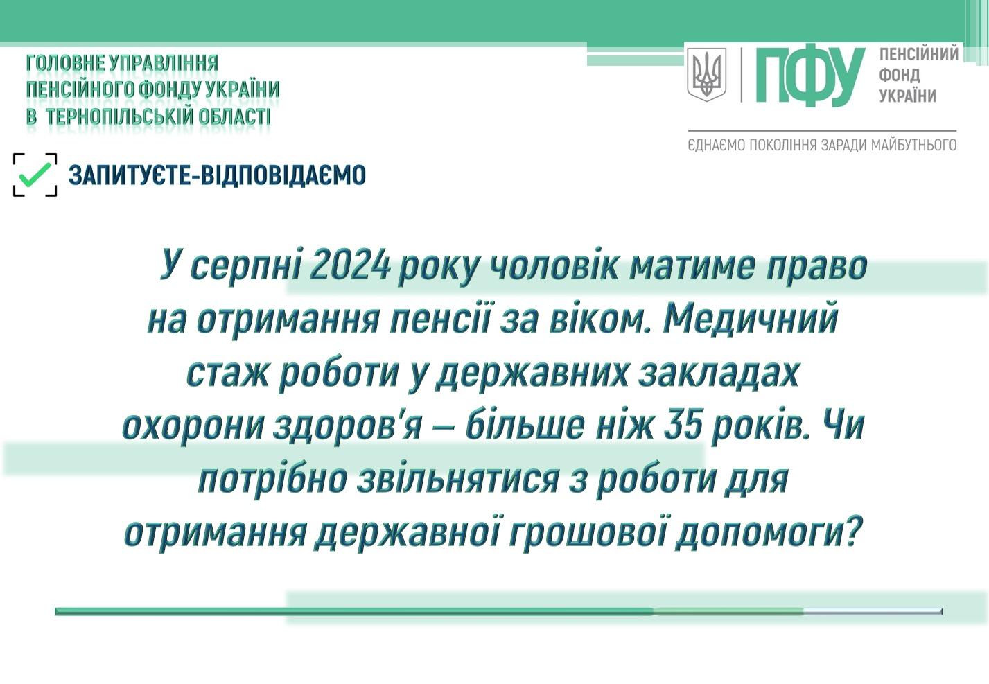 Запитуєте-відповідаємо! У серпні 2024 року чоловік матиме право на отримання пенсії за віком. Медичний стаж роботи у державних закладах охорони здоров’я — більше ніж 35 років. Чи потрібно звільнятися з роботи для отримання державної грошової допомоги?