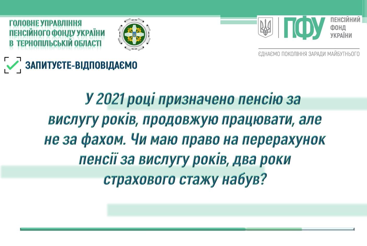 ЗАПИТУЄТЕ-ВІДПОВІДАЄМО У 2021 році призначено пенсію за вислугу років, продовжую працювати, але не за фахом. Чи маю право на перерахунок пенсії за вислугу років, два роки страхового стажу набув?
