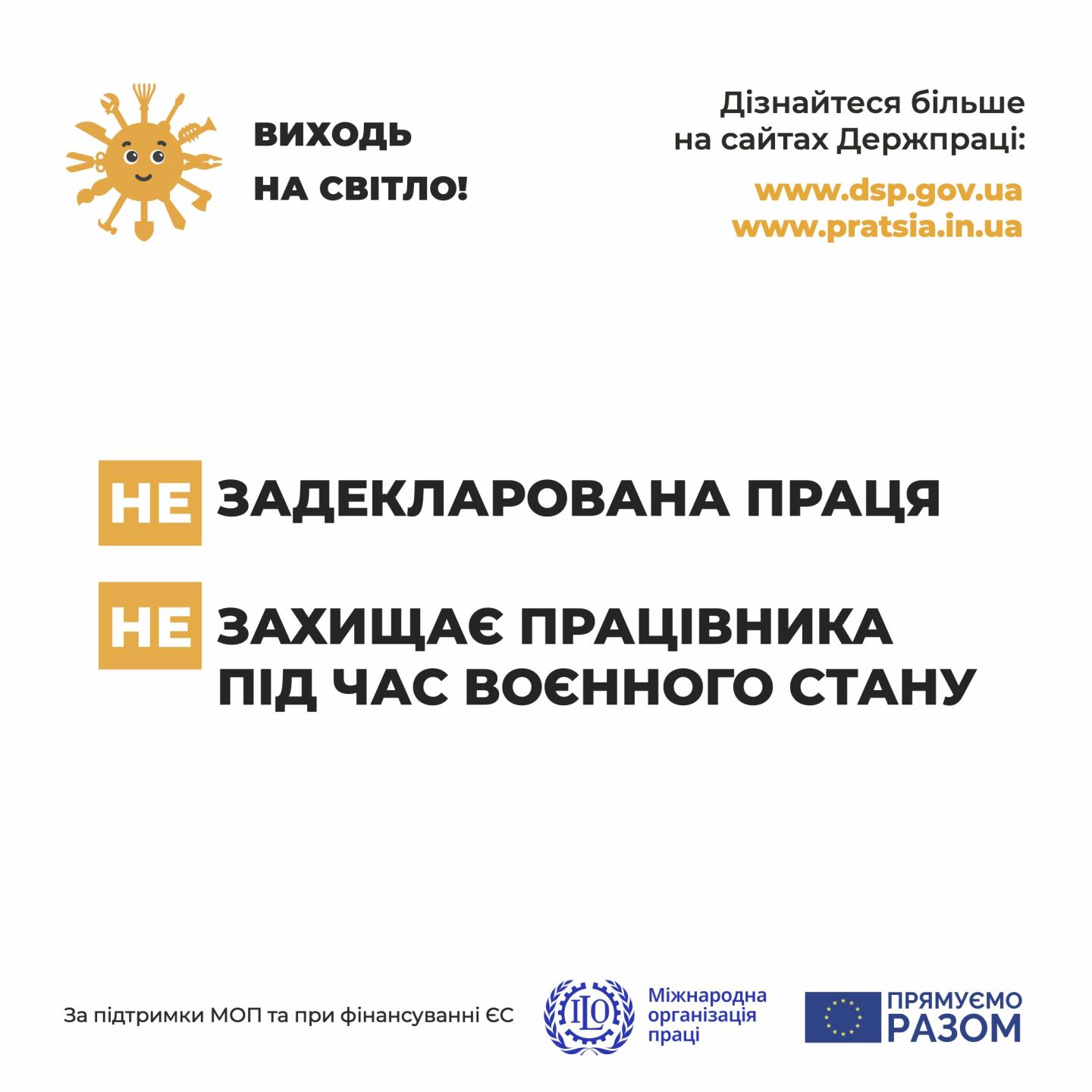 Саме тому, з 19 серпня Держпраці розпочала інформаційну кампанію «Виходь на світло!». Це черговий крок до формування у суспільства розуміння важливості оформлення трудових відносин. Основна мета донести до всіх громадян інформацію про ризики і наслідки незадекларованої праці, правильність оформлення трудових відносин та зміни у законодавстві.