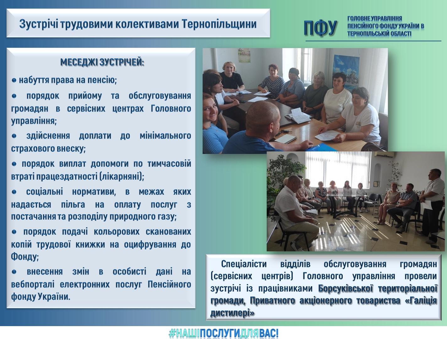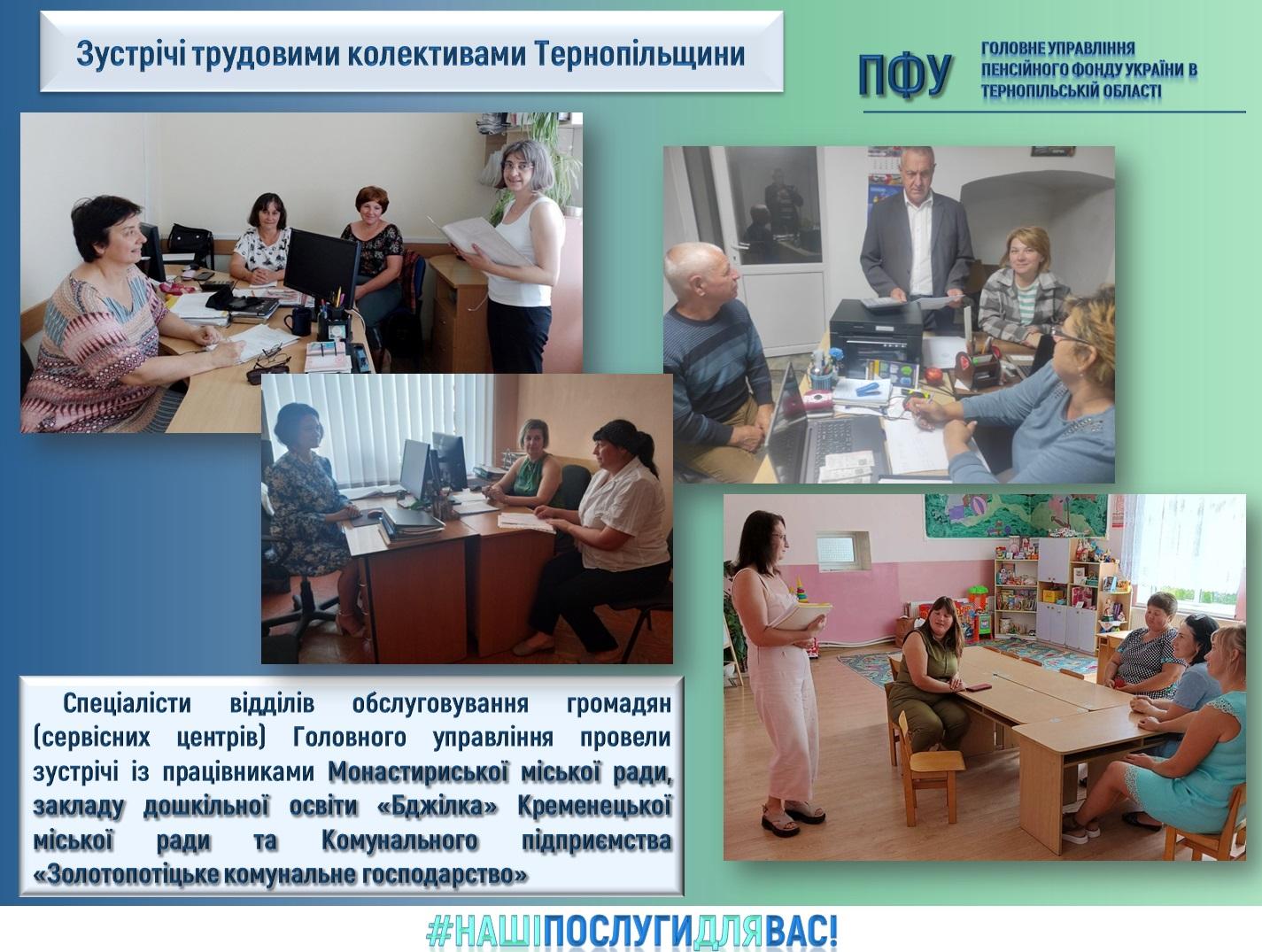 Спеціалісти відділів обслуговування громадян (сервісних центрів) Головного управління провели зустрічі із працівниками Борсуківської територіальної громади, Монастириської міської ради, закладу дошкільної освіти «Бджілка» Кременецької міської ради, Приватного акціонерного товариства «Галіція дистилері» та Комунального підприємства «Золотопотіцьке комунальне господарство».
