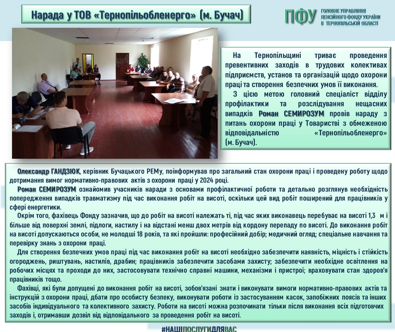 З цією метою головний спеціаліст відділу профілактики та розслідування нещасних випадків Роман Семирозум провів нараду з питань охорони праці у Товаристві з обмеженою відповідальністю «Тернопільобленерго» (м. Бучач).