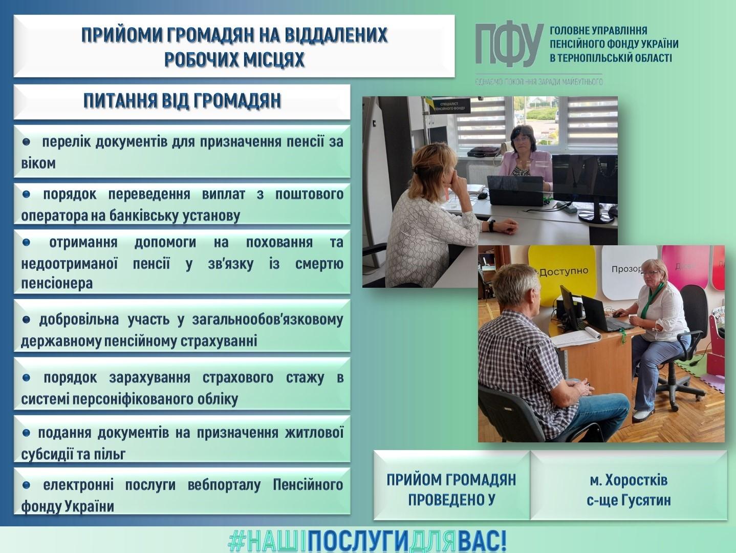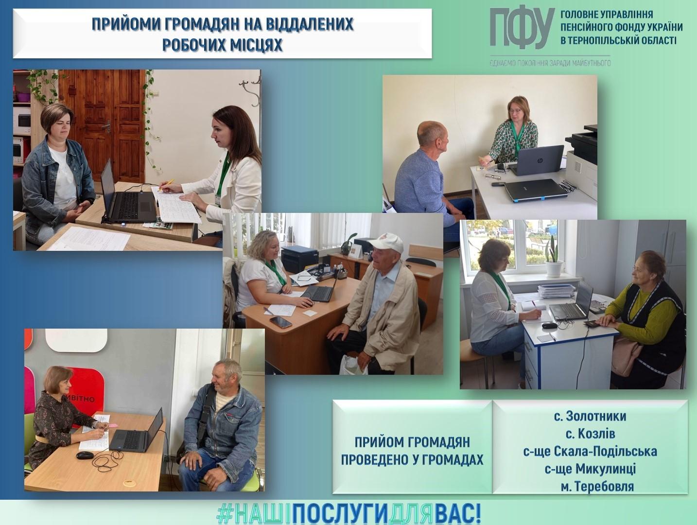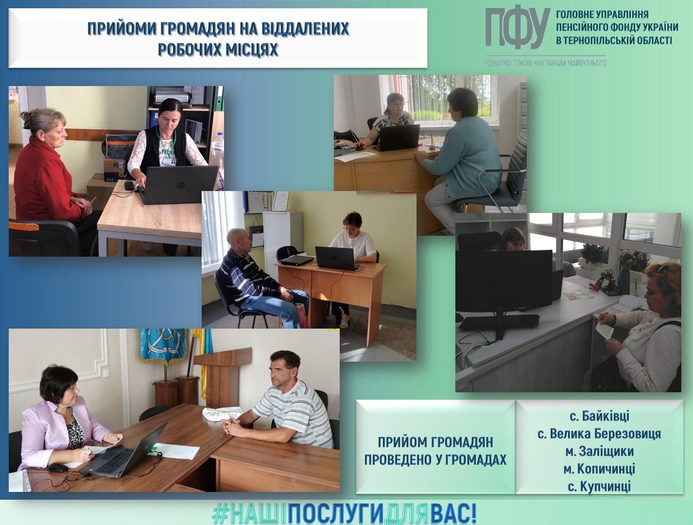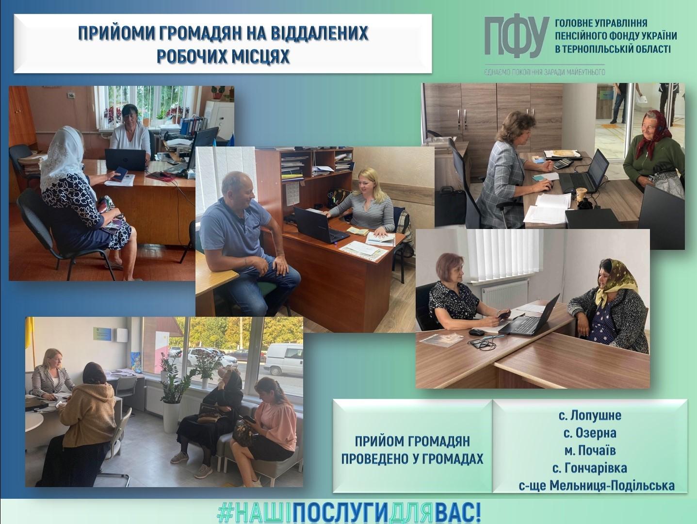 З цією метою спеціалісти Головного управління Пенсійного фонду України в області провели виїзні прийоми громадян у Гусятинській, Байковецькій, Хоростківській, Заліщицькій, Копичинецькій, Купчинецькій, Лопушненській, Почаївській, Мельнице-Подільській. Озернянській, Монастириській, Золотниківській, Козлівській, Скала-Подільській, Микулинецькій та Теребовлянській територіальних громадах.