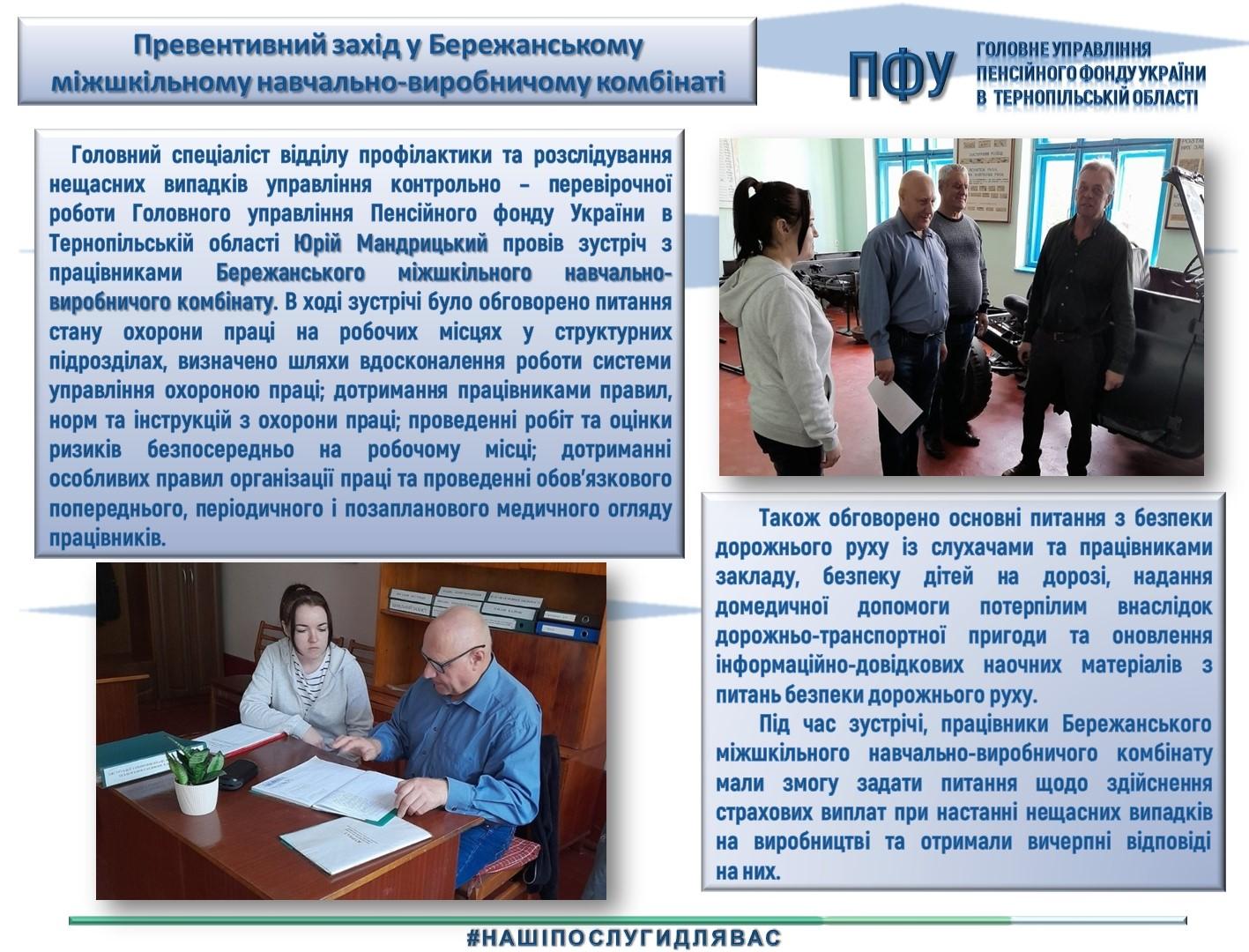 Головний спеціаліст відділу профілактики та розслідування нещасних випадків управління контрольно – перевірочної роботи Головного управління Пенсійного фонду України в Тернопільській області Юрій Мандрицький провів зустріч з працівниками Бережанського міжшкільного навчально-виробничого комбінату. В ході зустрічі було обговорено питання стану охорони праці на робочих місцях у структурних підрозділах, визначено шляхи вдосконалення роботи системи управління охороною праці; дотримання працівниками правил, норм та інструкцій з охорони праці; проведенні робіт та оцінки ризиків безпосередньо на робочому місці; дотриманні особливих правил організації праці та проведенні обов’язкового попереднього, періодичного і позапланового медичного огляду працівників.