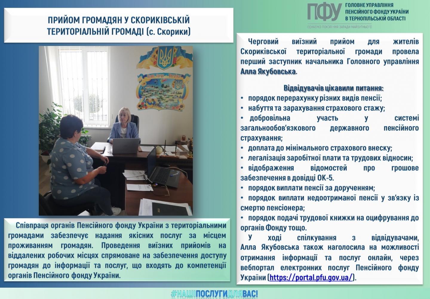 У ході спілкування з відвідувачами, Алла Якубовська також наголосила на можливості отримання інформації та послуг онлайн, через вебпортал електронних послуг Пенсійного фонду України (https://portal.pfu.gov.ua/).
