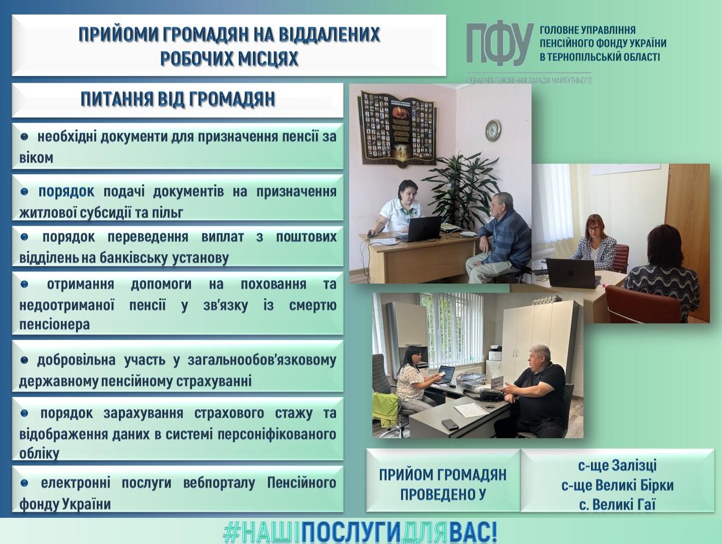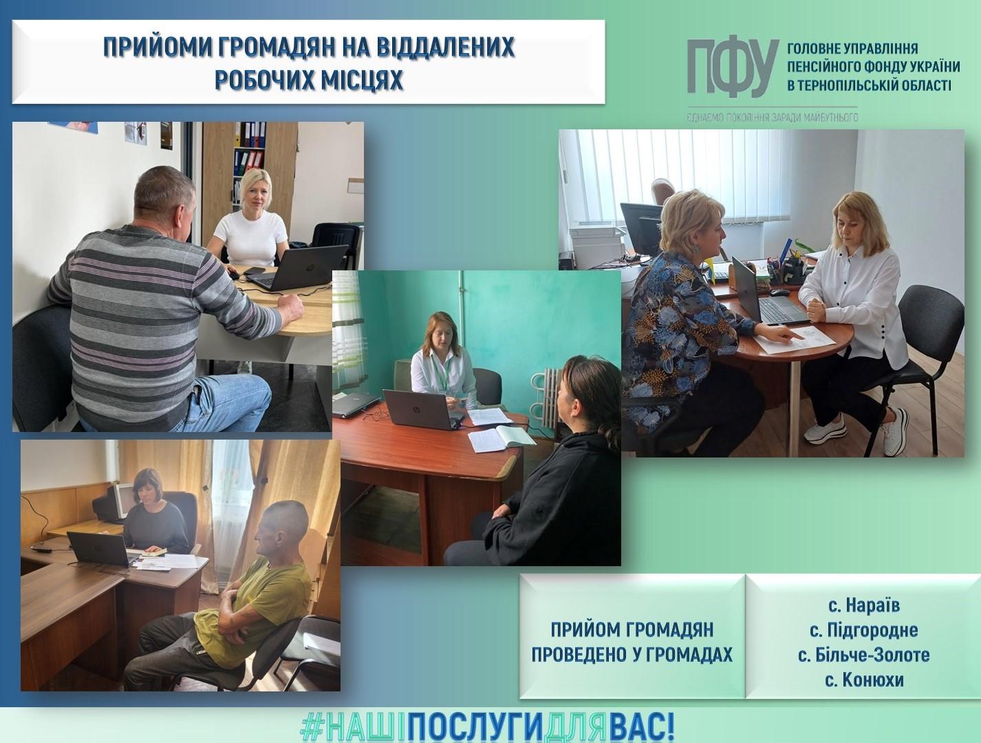 З цією метою спеціалісти Головного управління Пенсійного фонду України в області провели виїзні прийоми громадян у Великобірківській, Великогаївській, Нараївській, Залозецькій, Підгороднянській та Більче-Золототецькій територіальних громадах, а також у селі Конюхи Козівської територіальної громади.