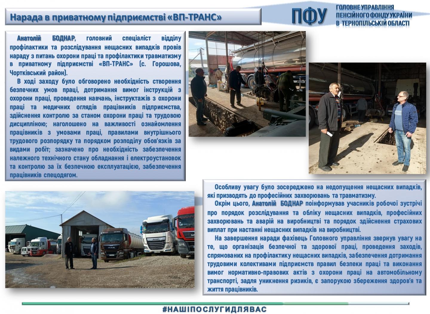 Анатолій Боднар, головний спеціаліст відділу профілактики та розслідування нещасних випадків провів нараду з питань охорони праці та профілактики травматизму в приватному підприємстві «ВП-ТРАНС» (с. Горошова, Чортківський район).