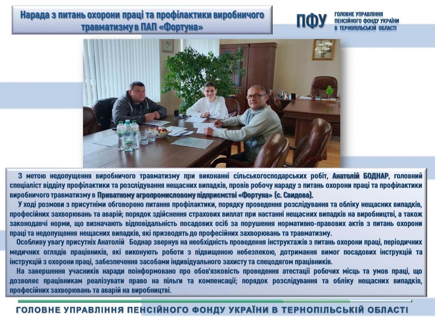 З метою недопущення виробничого травматизму при виконанні сільськогосподарських робіт, Анатолій Боднар, головний спеціаліст відділу профілактики та розслідування нещасних випадків, провів робочу нараду з питань охорони праці та профілактики виробничого травматизму в Приватному агропромисловому підприємстві «Фортуна» (с. Свидова).