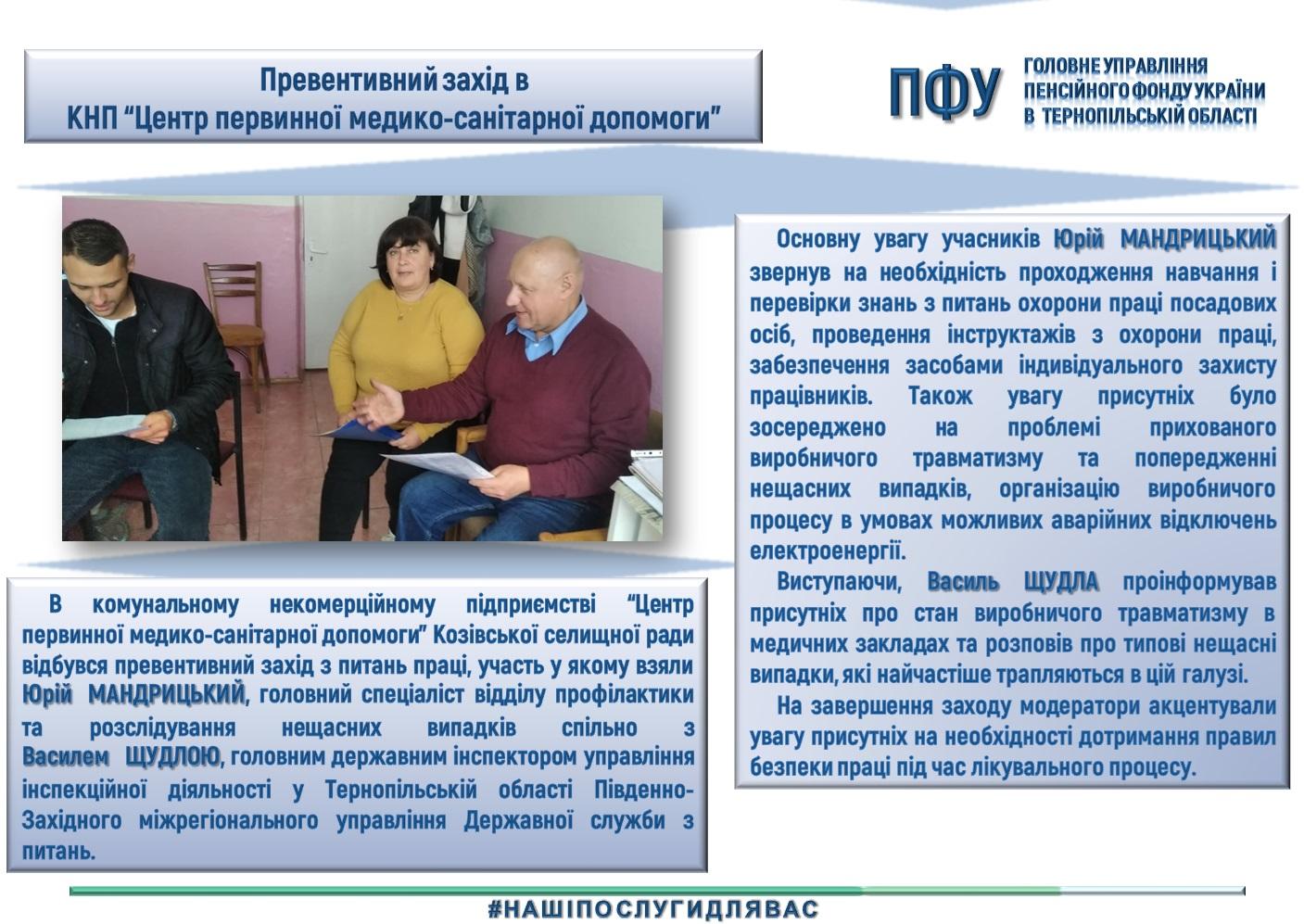В комунальному некомерційному підприємстві “Центр первинної медико-санітарної допомоги” Козівської селищної ради відбувся превентивний захід з питань праці, участь у якому взяли Юрій Мандрицький, головний спеціаліст відділу профілактики та розслідування нещасних випадків спільно з Василем Щудлою, головним державним інспектором управління інспекційної діяльності у Тернопільській області Південно-Західного міжрегіонального управління Державної служби з питань.