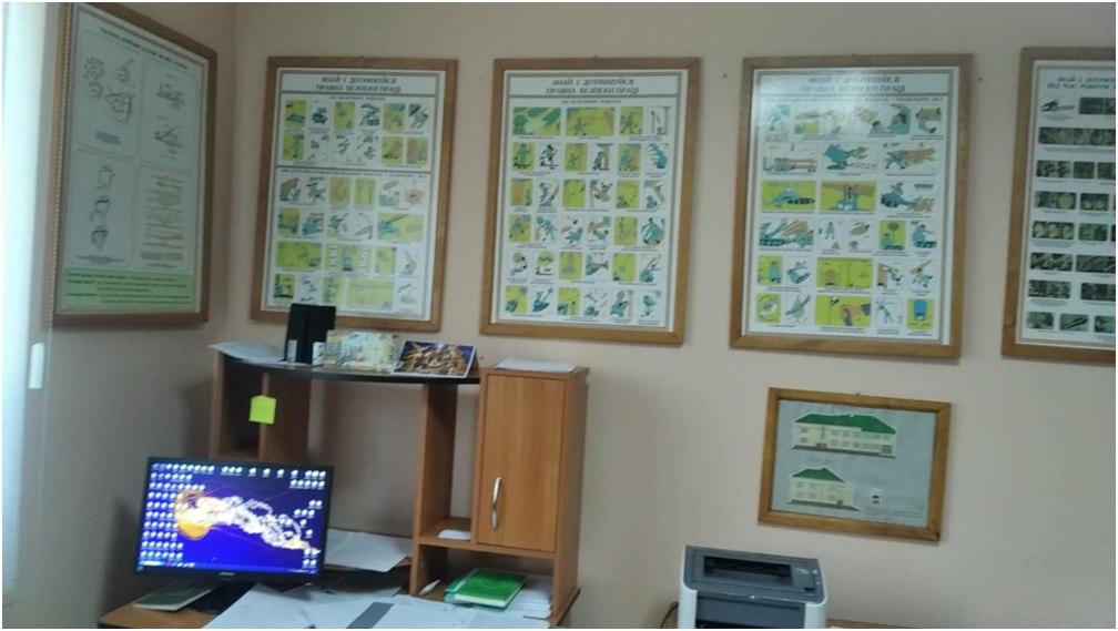 Кабінет з охорони праці площею 25 м2 обладнаний оргтехнікою, швидкісним інтернетом, нормативно-правовими актами з питань охорони праці, екології, технічного нагляду та пожежної безпеки, наочними посібниками, комп’ютерними програмами для проведення навчання, інструктажів та перевірки знань з охорони праці. Інженер з охорони праці забезпечений персональним комп’ютером.