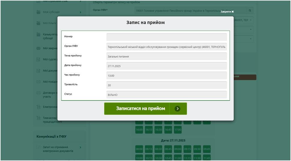На вебпорталі електронних послуг Пенсійного фонду України (https://portal.pfu.gov.ua/) функціонує онлайн-сервіс “Запис на прийом”.