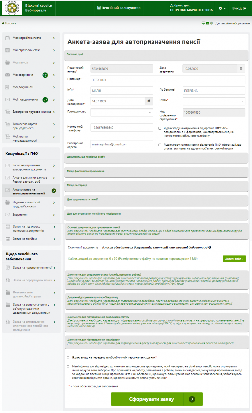 Натискаємо кнопку Продовжити й потрапляємо на бланк для формування Анкети-заяви на автопризначення пенсії.