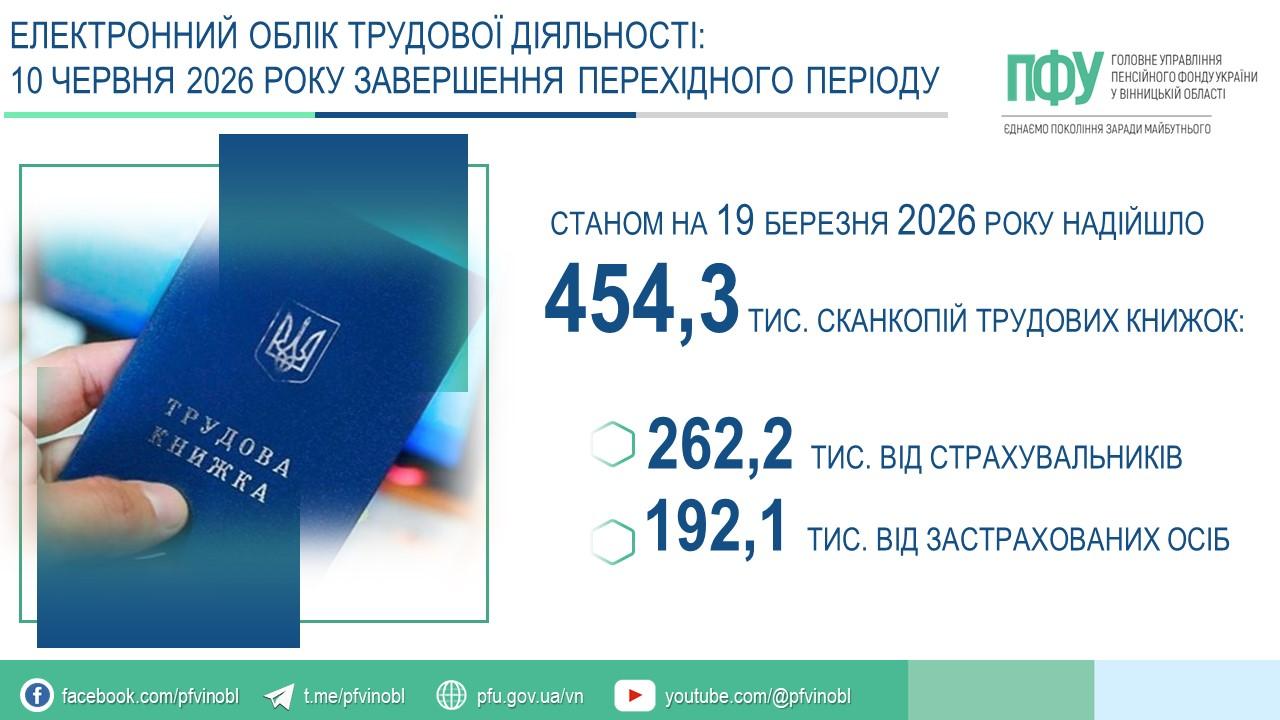 В Україні добігає кінця перехідний період запровадження електронної трудової книжки. Уже до 10 червня 2026 року громадянам необхідно оцифрувати свої трудові документи, щоб зберегти повну інформацію про страховий стаж. Станом на сьогодні процес активно триває: у Вінницькій області вже оцифровано понад 454 тисячі трудових документів. Водночас значна частина громадян ще не скористалася цією можливістю.