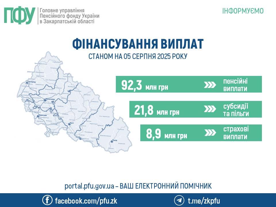 Пенсійний фонд України розпочав фінансування виплат жителям Закарпаття за серпень. На виплати уже спрямовано 123,0 млн гривень. Зокрема: