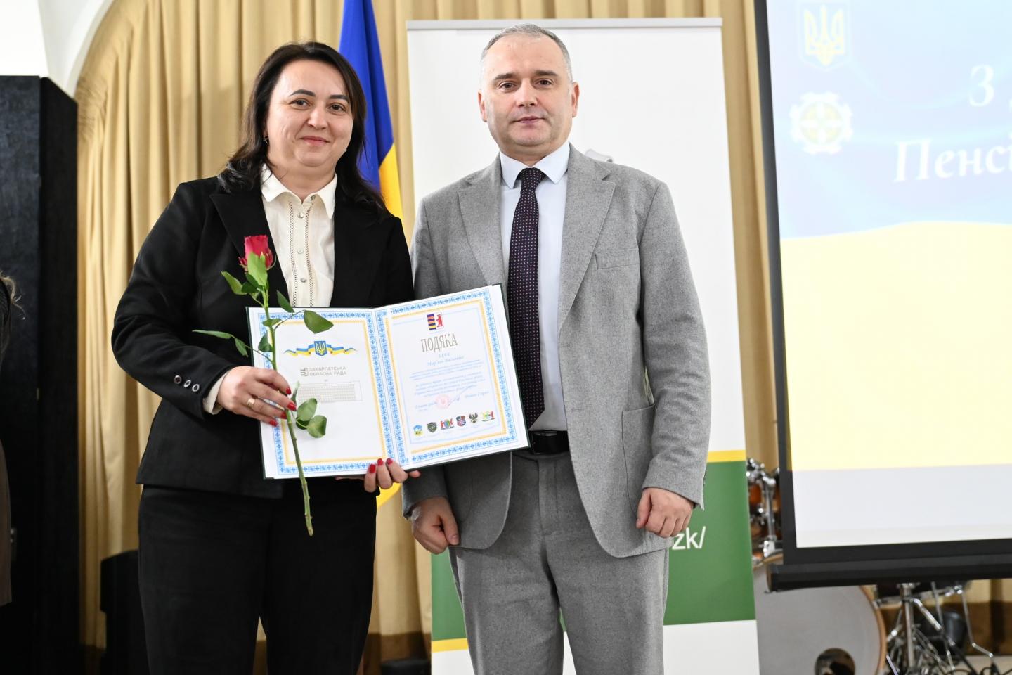 Звертаючись до учасників заходу, керівниця Головного управління Анастасія Пентек згадала шлях становлення Фонду на Закарпатті — від семи працівників у 1991 році до майже 600 фахівців сьогодні. Вона наголосила, що головною цінністю установи завжди залишалися люди, а в непрості для країни часи Пенсійний фонд є надійною опорою для пенсіонерів, родин Захисників і Захисниць України, ветеранів та всіх, хто потребує підтримки.