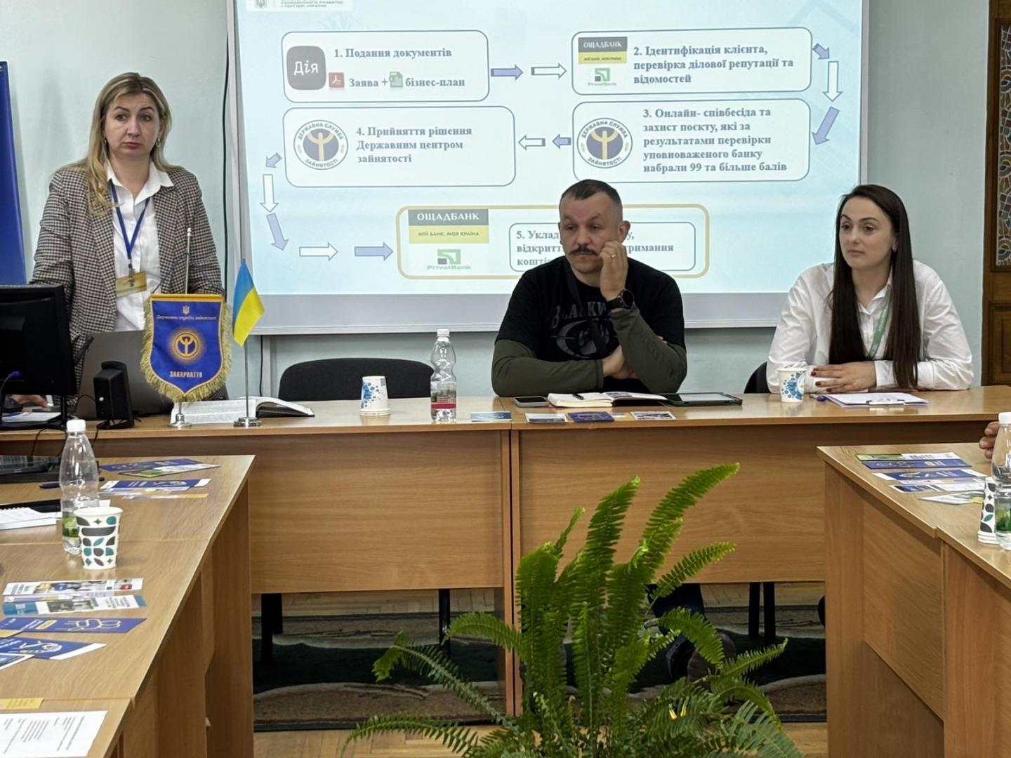 У Мукачівській філії Закарпатського обласного центру зайнятості відбувся спільний інформаційний захід для ветеранів за участю фахівців служби зайнятості, інспектора праці та представниці Головного управління ПФУ в області — головного спеціаліста відділу обслуговування громадян № 4 Інни Дички.