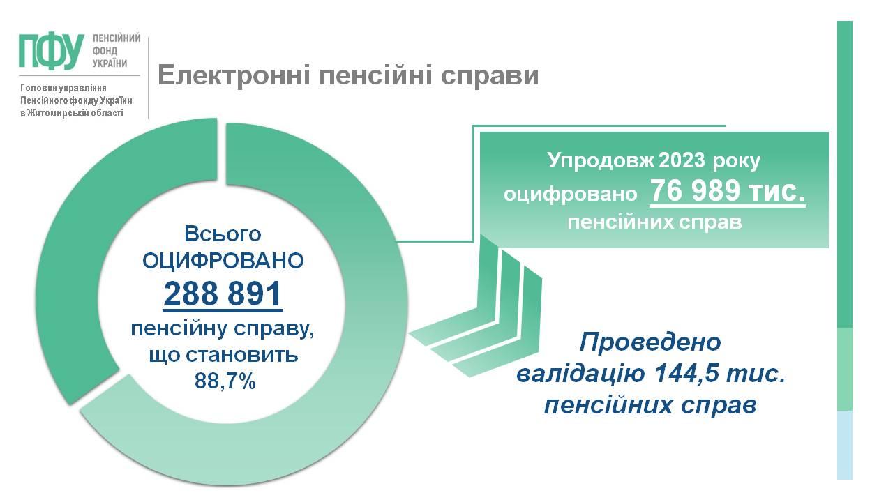 –  288,9 тис. пенсійних  справ,  з яких 77  тис.  оцифровано  упродовж    2023 року. Провалідовано  144,5  тис. пенсійних справ.