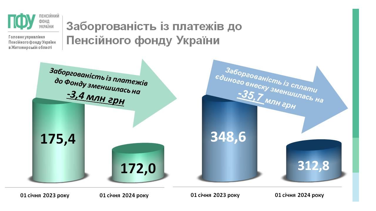 За даними Головного управління ДПС у Житомирській області (надалі – Головне управління ДПС) заборгованість  зі    сплати    єдиного    внеску   на загальнообов’язкове державне соціальне страхування (далі – єдиний внесок) станом  на  01.01.2024  складає  320,3 млн грн. У порівнянні з початком 2023 року  дана заборгованість зменшилась  на 10,3 %  або на 35,8 млн грн.