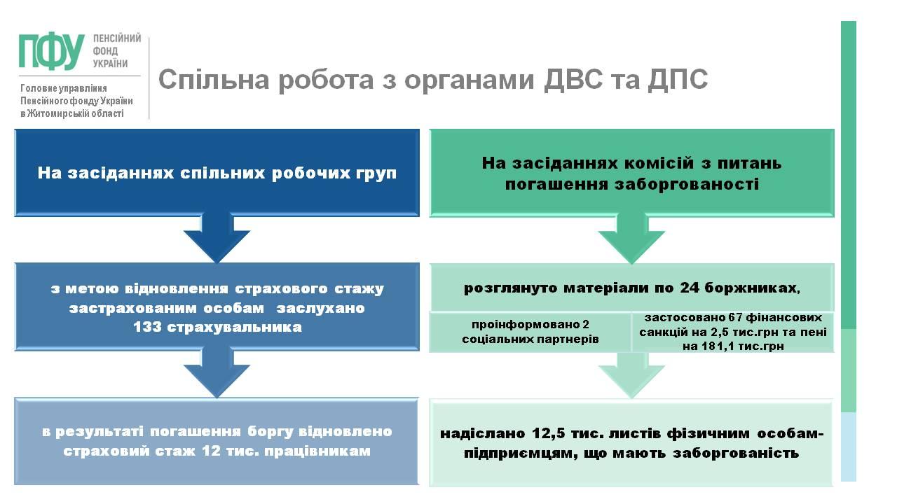 Slajd14 - Огляд основних підсумків роботи Головного управління Пенсійного фонду України в Житомирській області за 2023 рікЗ метою  погашення  заборгованості,  захисту прав застрахованих осіб та відновлення їм страхового стажу на засіданнях спільних робочих груп у складі Головного управління, Головного управління ДПС та органів Державної виконавчої служби заслухано 133 страхувальника. На засіданнях комісій з питань погашення заборгованості розглянуто матеріали по 24 боржниках. В результаті проведеної роботи погашено заборгованість на 3,4 млн грн та відновлено страховий стаж 11,6 тис. застрахованих осіб.