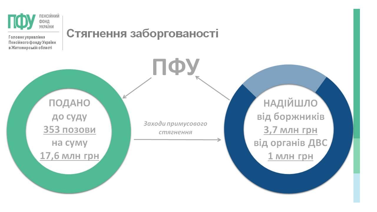 Slajd16 - Огляд основних підсумків роботи Головного управління Пенсійного фонду України в Житомирській області за 2023 рікУпродовж 2023 року  Головним  управлінням   подано  до  суду 353 позови про стягнення боргу з  відшкодування витрат на виплату і доставку пенсій, призначених на пільгових умовах в сумі 17,6 млн грн. Заходами примусового стягнення охоплено 100 % заборгованості, що підлягає стягненню в  судовому  порядку.  В  ході  розгляду  позовних  заяв  про  стягнення  боргу  від    боржників   Головного   управління надійшло  майже 3,7 млн грн.