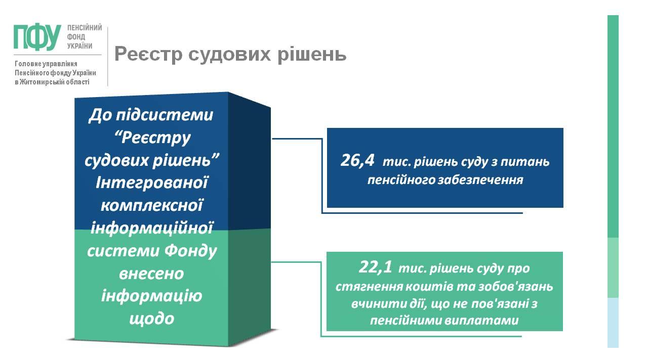 Slajd17 - Огляд основних підсумків роботи Головного управління Пенсійного фонду України в Житомирській області за 2023 рікВнесено інформацію до підсистеми «Реєстр судових рішень» Інтегрованої комплексної інформаційної системи  Фонду  про  26,4 тис. рішень суду з питань пенсійного забезпечення  та 22,1 тис. рішень суду про стягнення коштів та зобов’язань вчинити дії, що не пов’язані з пенсійними виплатами. Крім того, до підсистеми «Правова робота» Інтегрованої комплексної інформаційної системи Фонду внесено інформацію про відкриття 21,8 тис. позовних проваджень  у спорах  з   питань   пенсійного  забезпечення,  про  27,6  тис.  рішень  суду  першої інстанції, 2,5 тис. рішень  апеляційних судів та 256 рішень касаційного  суду.