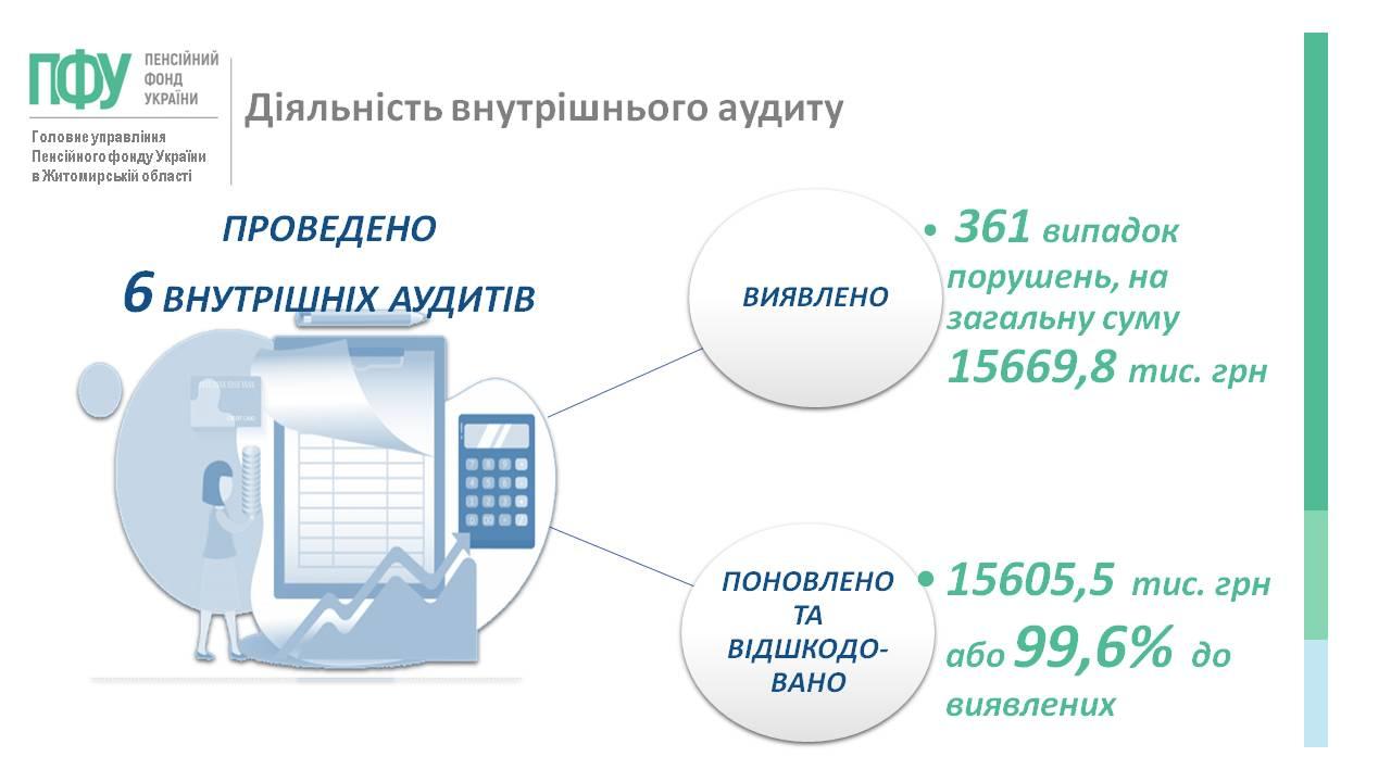 Slajd19 - Огляд основних підсумків роботи Головного управління Пенсійного фонду України в Житомирській області за 2023 рікУпродовж 2023 року  проведено 6 внутрішніх аудитів. За результатами проведених аудиторських досліджень виявлено 361 випадок порушень вимог чинного законодавства, з яких 298 випадків нефінансових порушень та 63 випадки фінансових порушень на загальну суму 15668  тис. грн.
