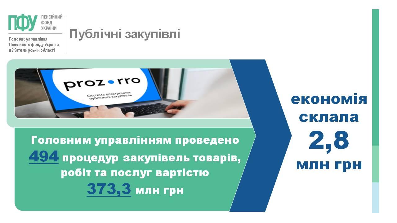 Slajd20 - Огляд основних підсумків роботи Головного управління Пенсійного фонду України в Житомирській області за 2023 рікУпродовж 2023 року Головним управлінням проведено 494 процедури закупівель товарів, робіт та послуг  з очікуваною вартістю 373,3 млн грн. За результатами здійснення закупівель товарів, робіт та послуг в системі «ProZorro» економія склала майже 2,8 млн грн.
