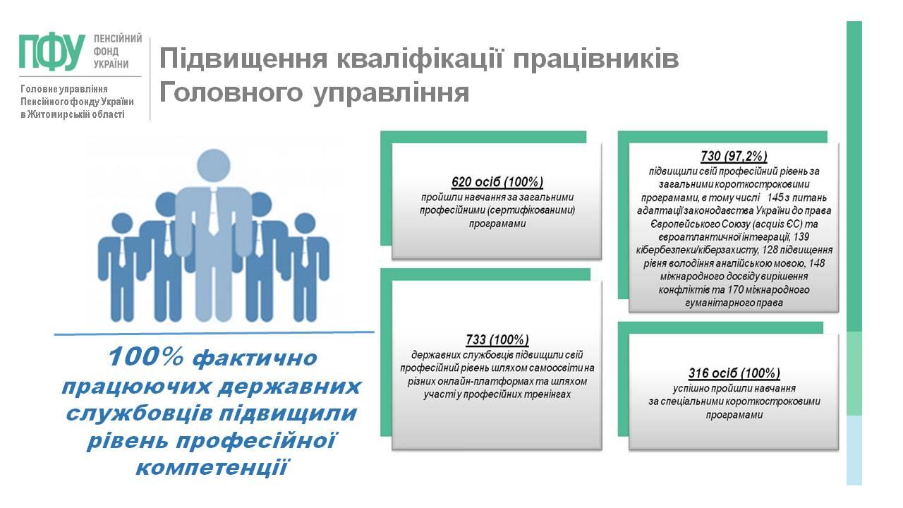Slajd22 - Огляд основних підсумків роботи Головного управління Пенсійного фонду України в Житомирській області за 2023 рікВідповідно до затверджених індивідуальних програм професійного розвитку підвищено рівень професійної компетентності 100 % фактично працюючих державних службовців Головного управління.