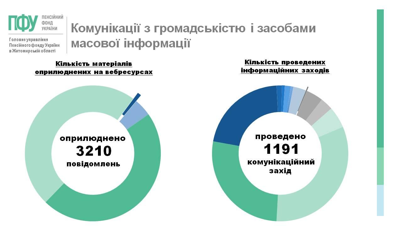 Slajd23 - Огляд основних підсумків роботи Головного управління Пенсійного фонду України в Житомирській області за 2023 рікЗабезпечено оперативне висвітлення питань діяльності Головного управління в засобах  масової  інформації. На інформаційних ресурсах оприлюднено 3,2 тис.  матеріалів, фахівцями Головного  управління проведено  1,2 тис. комунікаційних заходів.