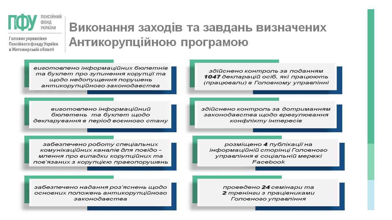 Slajd24 - Огляд основних підсумків роботи Головного управління Пенсійного фонду України в Житомирській області за 2023 рікВ межах здійснення заходів щодо запобігання та протидії корупції оцінено корупційні ризики в діяльності Головного управління, забезпечено 100 % виконання заходів та завдань визначених Антикорупційною програмою Пенсійного фонду України та його органів на 2021 – 2023 роки.