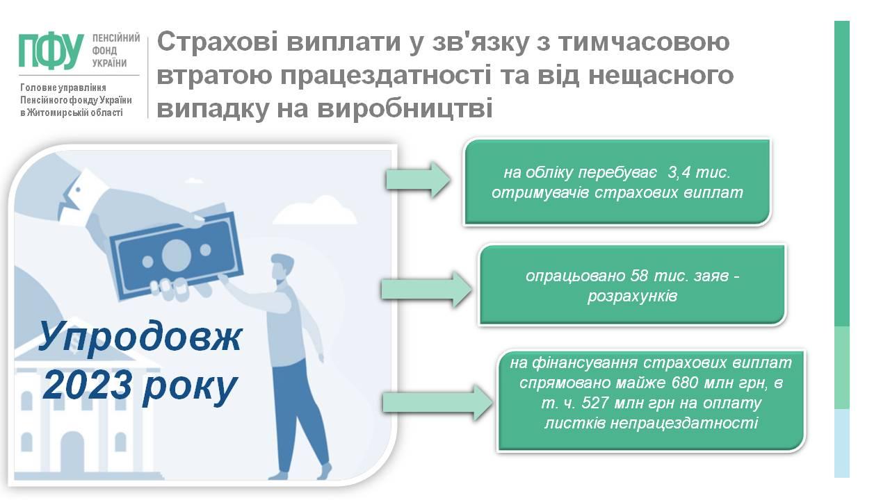 Slajd5 - Огляд основних підсумків роботи Головного управління Пенсійного фонду України в Житомирській області за 2023 рікУпродовж 2023 року Головним управлінням забезпечено щомісячні  страхові виплати 3,4 тис. потерпілим внаслідок нещасного випадку на виробництві та професійного захворювання, а також особам, які мають на це право в разі смерті потерпілого.