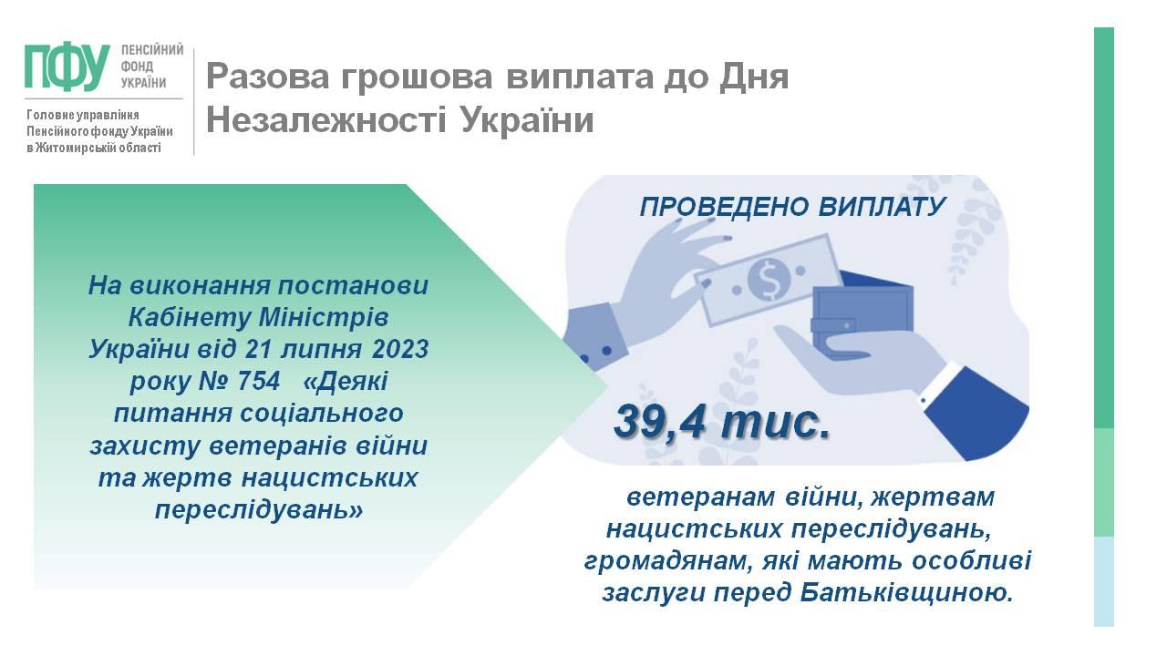 Slajd6 - Огляд основних підсумків роботи Головного управління Пенсійного фонду України в Житомирській області за 2023 рікНа виконання постанови Кабінету Міністрів України від 21 липня 2023 року № 754 «Деякі питання соціального захисту ветеранів війни та жертв нацистських переслідувань» проведено виплату разової грошової виплати до Дня Незалежності України 39,4 тис. ветеранам війни, жертвам нацистських переслідувань,  громадянам, які мають особливі заслуги перед Батьківщиною.