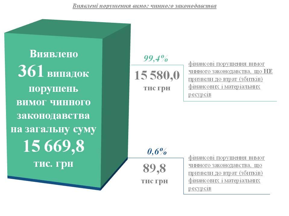 За результатами проведених аудиторських досліджень виявлено 361 випадок порушень вимог чинного законодавства, а саме: 298 випадків не фінансових порушень та 63 випадки фінансових порушень.